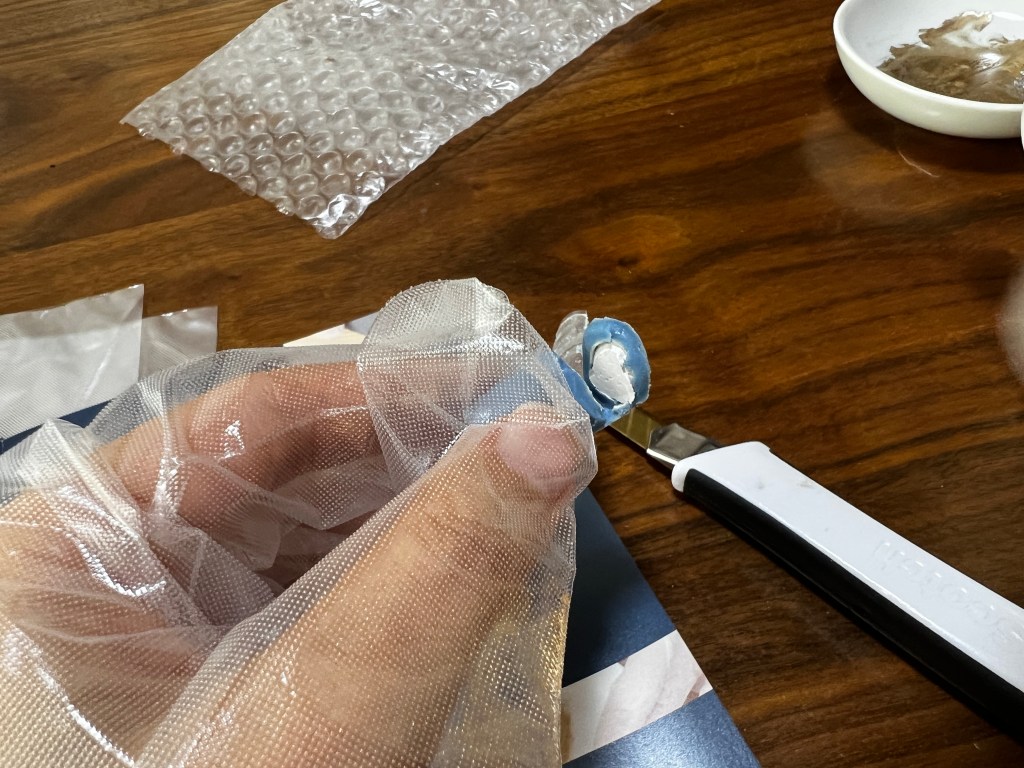 欠けの補修にはエポキシパテという粘土のようなものを練ってかけ部分に埋め込んでいくそうです。パテを少し削ってネリネリして薄い水色になるまで練ります。粘土遊びのようで楽しい。なんとなくストレスも解消されていくような気がします。