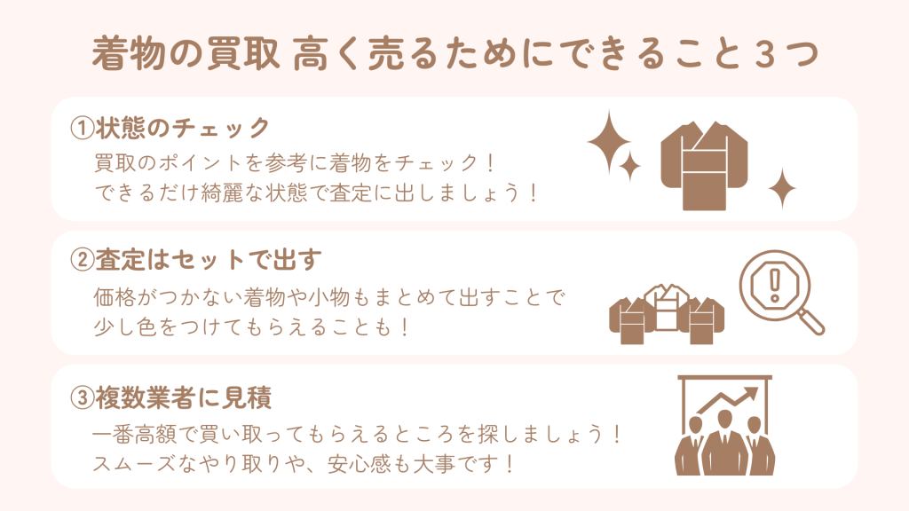 なので、大事にしたい着物、手元に置いておきいたい着物はないか、買取に出す前に一度もう一度向き合ってみてください。その上で保管するコストを考えて、「他に着てくれる人がいるならその方が着物のため」と考えて気持ちと折り合いをつけることが大事です。誰かから譲り受けた着物なら、受け継いでくれた人のためにも誰かに渡す方が、着物は生きるはずです。