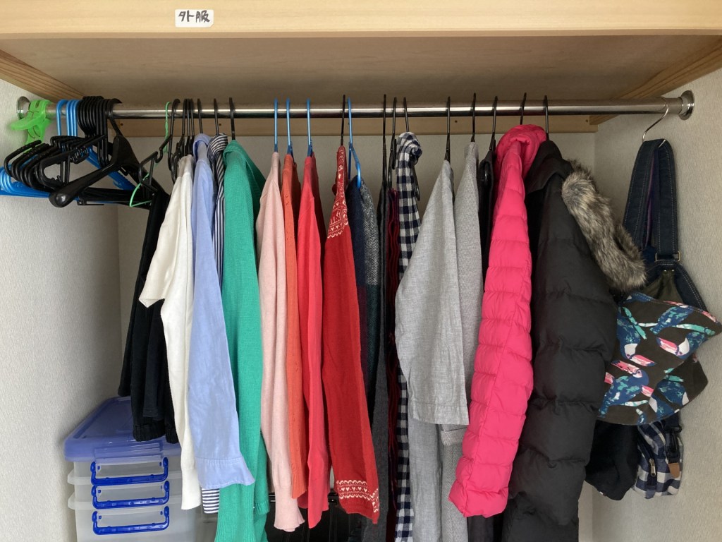 必要なものをクローゼットの手前に配置。これから着るだろう薄手のコートや長袖のシャツ、スウェット類は手の届きやすいところに。厚手のコートやセーター類は一まとめにしておきますが、まだ出しません(私はサマリーポケットで預けています)。