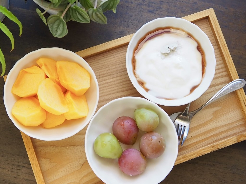りんごや柿をヨーグルトに加えると、ビタミンと乳酸菌が同時にとれて一日のスタートが快適に。
